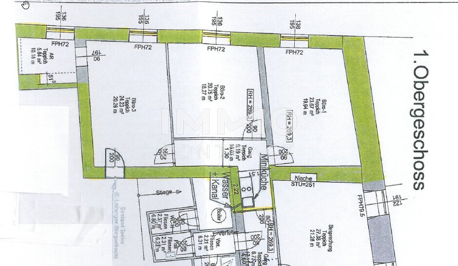 Raumaufteilung: 3 Büros mit Abstellraum und Platz für kleine Teeküche. Die WC-Anlagen werden mit einem angrenzendem Büro gemeinsam genutzt.