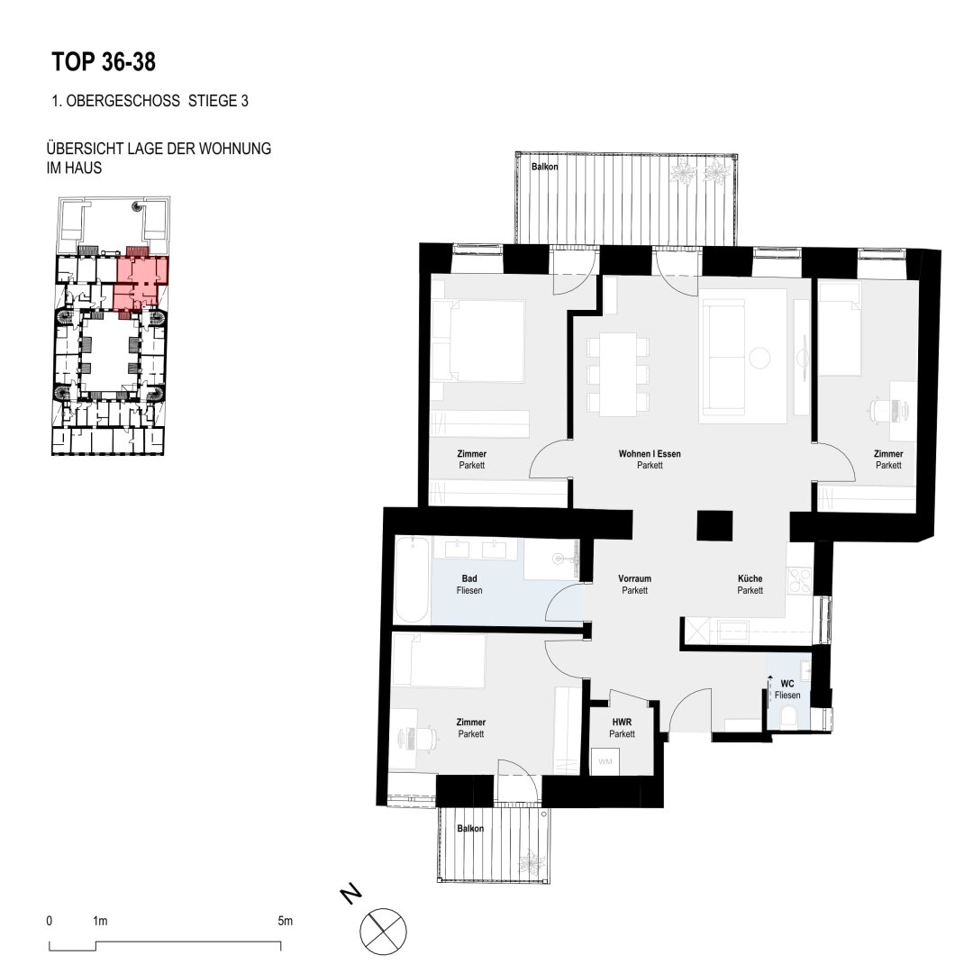 Die Wohnung Top 36–38 befindet sich im 1. Obergeschoss und überzeugt durch einen gut gegliederten Grundriss mit drei separat begehbaren Zimmern, einem großzügigen Wohnbereich sowie zwei Balkonen.