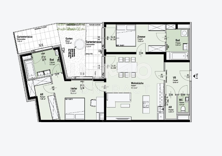 Willkommen in Ihrem neuen Zuhause: Diese großzügige, komplett hofseitig ausgerichtete 3-Zimmer-Gartenwohnung überzeugt mit rund 91 m² Wohnnfläche, zwei Terrassen sowie einem privaten Garten. Die helle Wohnküche mit direktem Zugang zur südostseitigen Gartenterrasse bildet das Herzstück der Wohnung und schafft einen fließenden Übergang zwischen Innen-