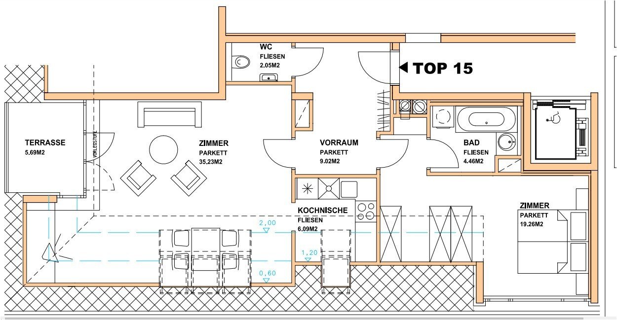 Lichtdurchflutete, klimatisierte DG-Wohnung mit Terrasse: Vorraum, Wohnzimmer (mit Terrasse), Küche (Nische), 1 Schlafzimmer, Bad mit Wanne, separates WC mit Handwaschbecken.