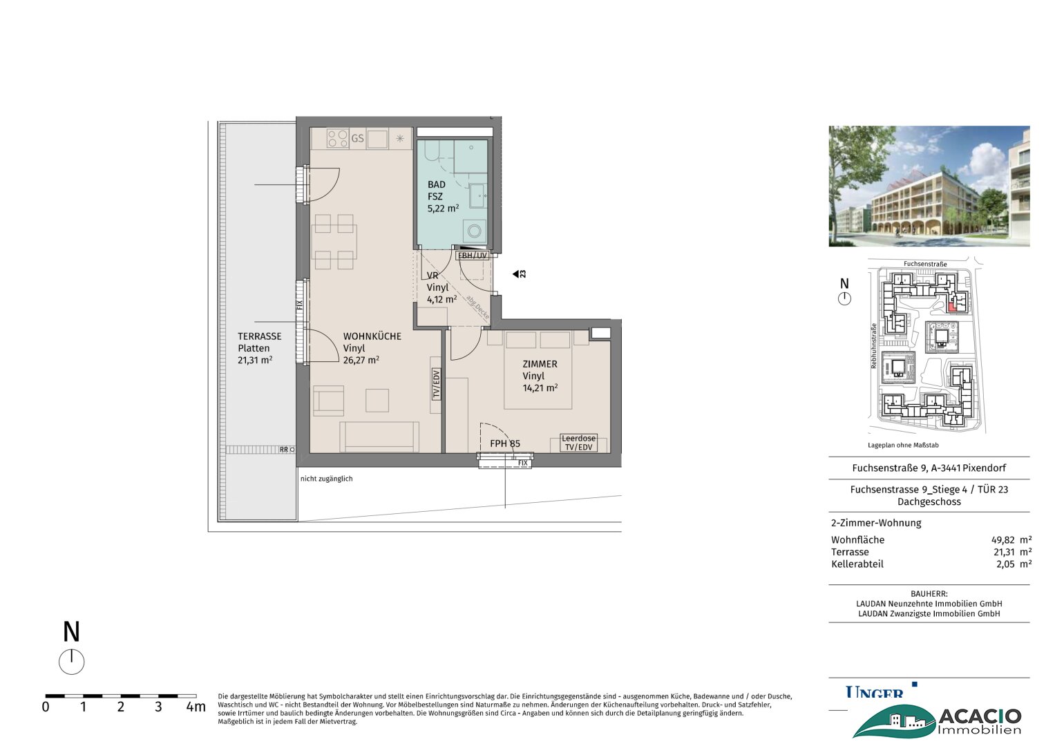 Diese helle, freundliche 2-Zimmer-Neubauwohnung verfügt über ca. 49,82m² Wohnfläche und einer ausladenden Terrasse mit 21,31m².