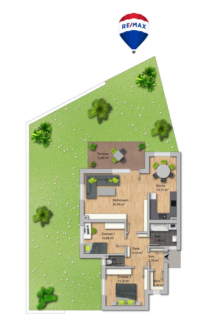 • 147 m² Privatgarten plus 12 m² Sonnenterrasse.