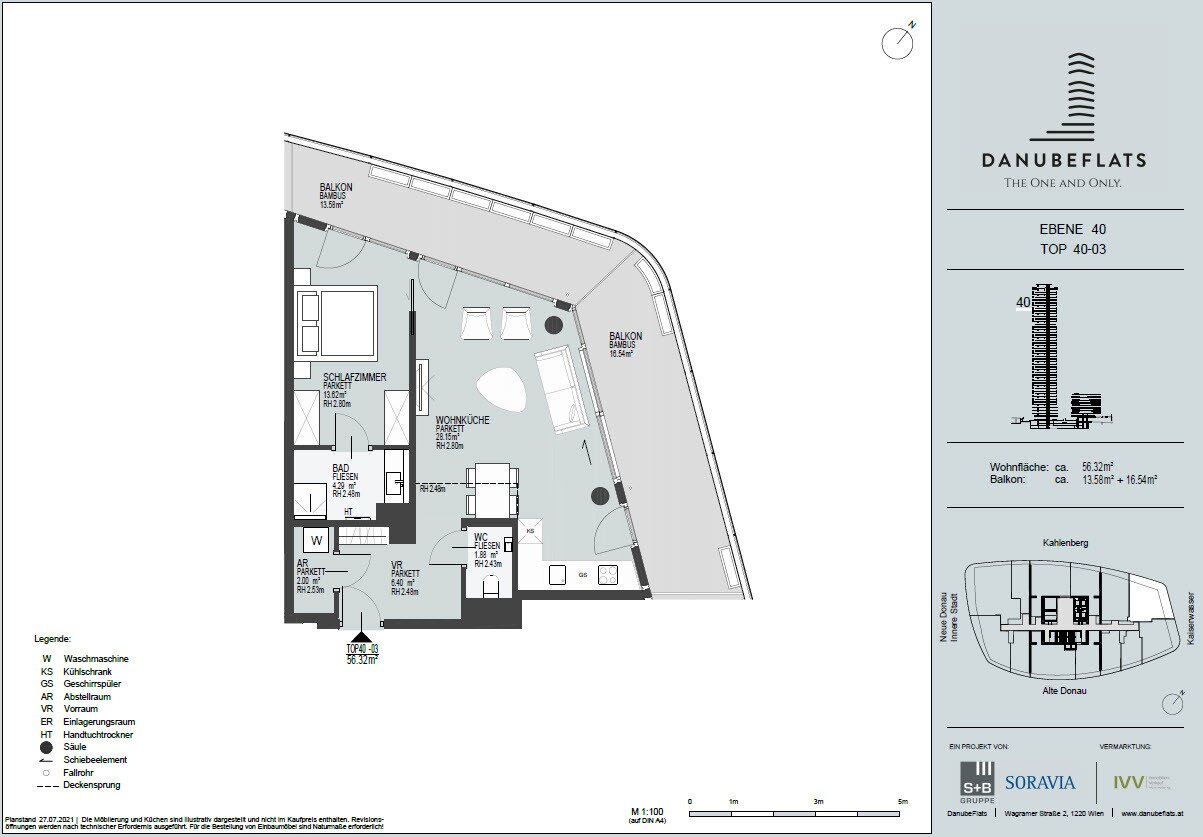 Zum Verkauf steht eine exklusive Wohnung mit ca. 56 m² Wohnfläche sowie einem Balkon mit ca. 30m² im 40. Stock. Der