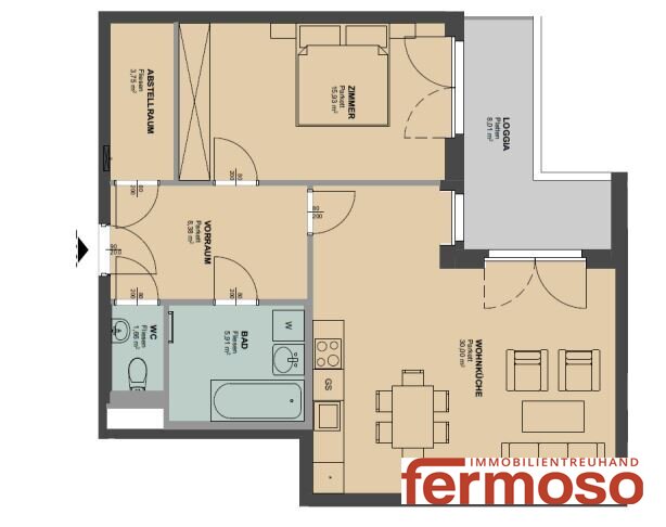 Mit einer großzügigen Fläche von 73,64 m² bietet die Wohnung drei helle und einladende Zimmer, die ausreichend Platz für Familie, Homeoffice oder