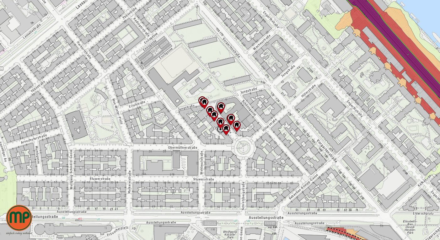 Die Verkehrsanbindung ist exzellent: U2 Messe-Prater und U1 Vorgartenstraße sind in wenigen Minuten zur Fuß erreicht, außerdem ideale Anbindung an A22/A23 mit dem Auto.