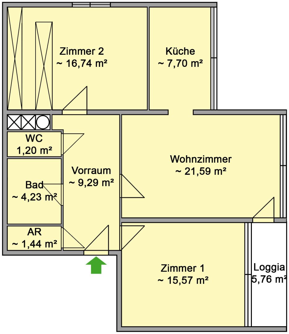Die etwa 77 m² große Wohnung liegt im 1. Stock ohne Lift und unterteilt sich in einen Vorraum, ein Wohnzimmer mit Zugang zu Loggia und Küche, zwei
