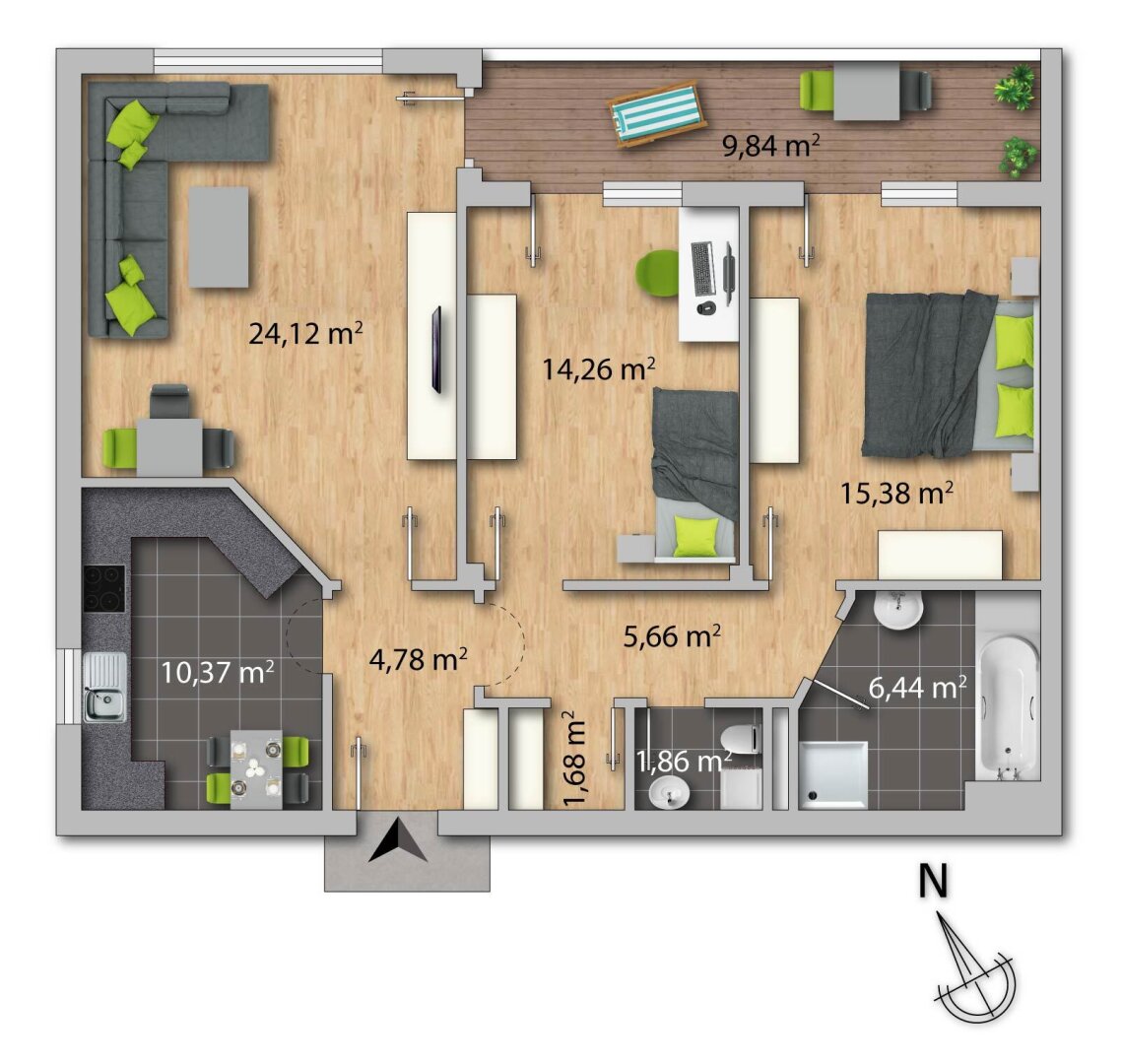 Die Wohnung verfügt über 84,35 m² Wohnfläche sowie eine verglaste Loggia mit 9,97 m², die von allen Zimmern aus begehbar ist und als zusätzlicher Wohnraum genutzt werden kann.