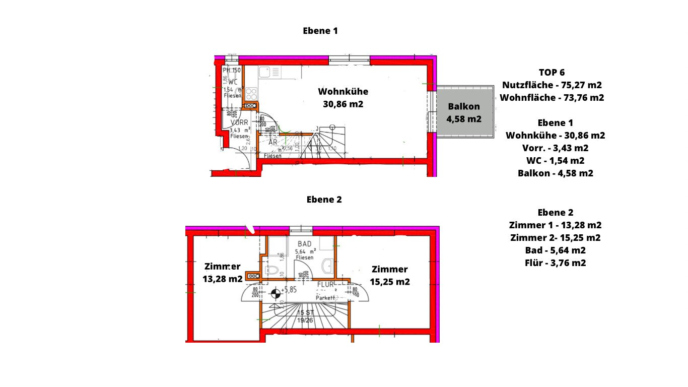 Die Maisonette-Wohnung erstreckt sich über zwei Ebenen und umfasst drei Zimmer. Auf der ersten Ebene befinden sich eine offene Wohnküche mit Zugang zu einem Balkon sowie ein Gäste-WC. Eine elegante Holztreppe führt