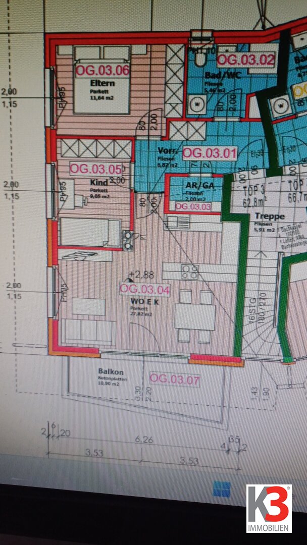 Vom Vorraum aus erreicht man den großzügigen Wohnbereich mit Küche u. Balkon, 2 Schlafzimmer, Badezimmer mit Dusche u. WC sowie einem Waschmaschinanschluß und Abstellraum.