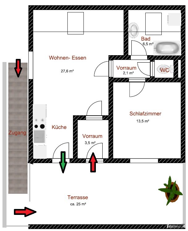 Vorraum, Wohn-Esszimmer mit offener Küche (möbliert) und Ausgang auf die Terrasse, Badezimmer mit Eckbadewanne, Fenster und Waschmaschinen-Anschluß, extra WC und Schlafzimmer.
