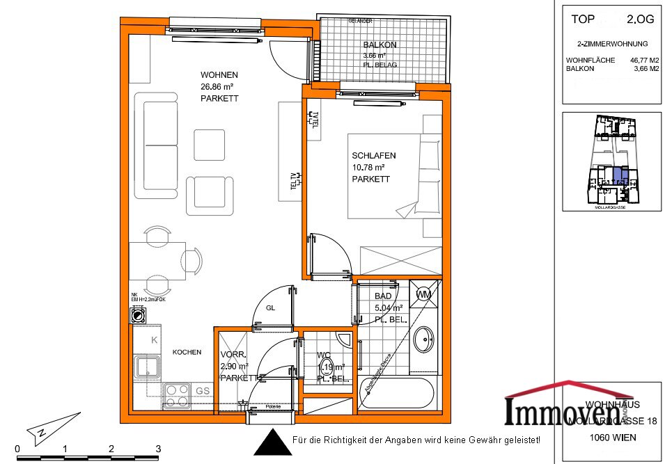 Die 2-Zimmerwohnung befindet sich im 2. Obergeschoss (Lift vorhanden), bietet eine Nutzfläche von ca. 47 m² und einen Balkon.