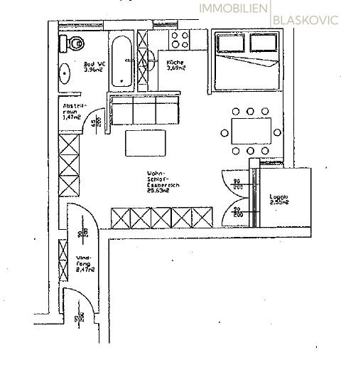 Die Wohnung ist nach Osten ausgerichtet und verfügt über einen kleinen Eingangsbereich, eine moderne Küche mit Bar (Geschirrspüler, Backrohr, Ceran-Kochfeld) die mittels Fenster auch belüftet werden kann. Der Wohnbereich ist so konstruiert, dass neben einem Sofa, Kasten