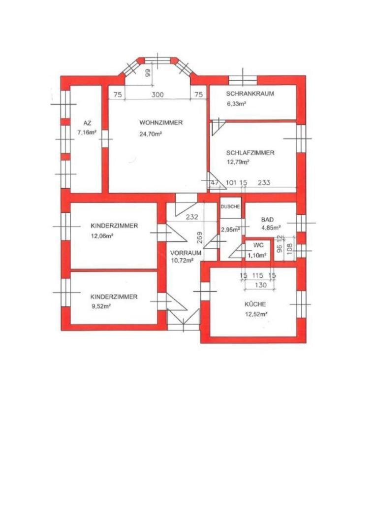 Die Wohnung gliedert sich in einen großzügigen Vorraum, Küche, Wohnzimmer, Schlafzimmer mit Schrankraum, Arbeitszimmer, zwei Kinderzimmer, Badezimmer mit Dusche und ein separates WC