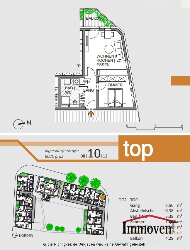 + Wohnraum mit integrierter Küchenzeile und Zugang auf den Balkon