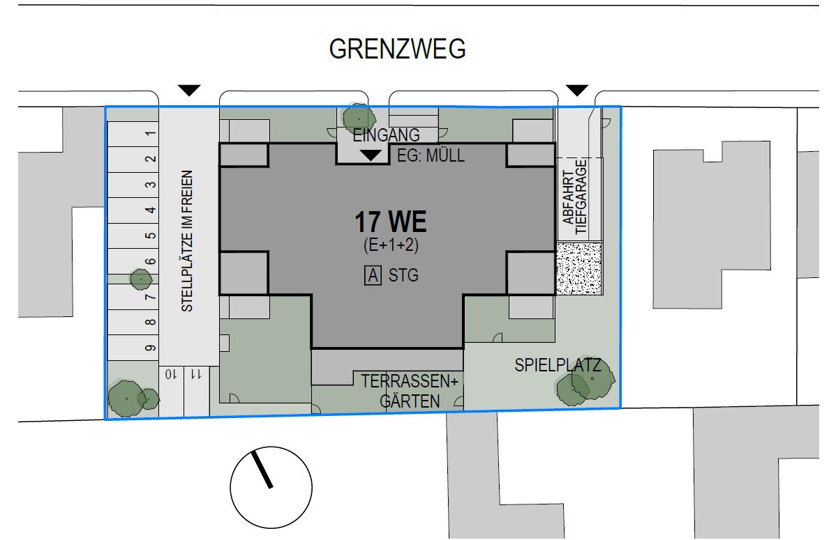 In grüner, ruhiger Wohnlage – Grenzweg 11 –, dennoch nur fünf Fahrradminuten vom Bahnhof entfernt, haben wir ein kleinteiliges Niedrigenergiewohnhaus mit siebzehn Eigentumswohnungen in den Größen von 54 bis 108 m² Wohnnutzfläche gebaut. Alle Wohnungen sind auch mit Steuervorteil als Vorsorgewohnungen zu haben. Da sowohl die Fußbodenheizung als auch die Wasseraufbereitung