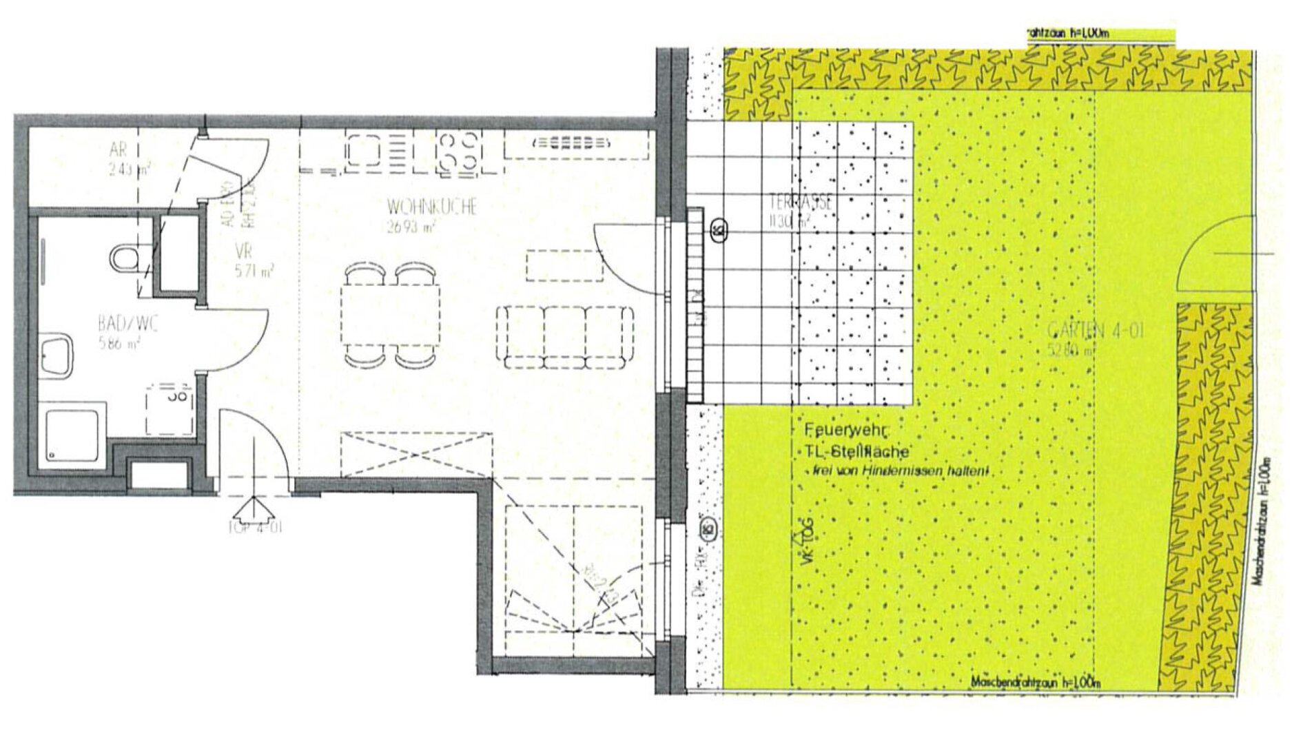 Herzstück der Wohnung ist die großzügige Wohnküche (ca. 26,9 m²), die viel Platz für Ihre individuelle Gestaltung bietet – ob gemütliche Sofaecke