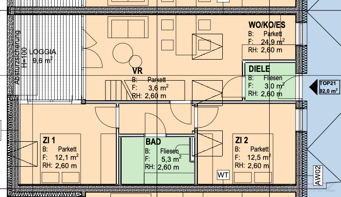 Die Top 21 teilt sich wie folgt auf: Diele, Bad inkl. WC, Wohn/Kochen/Essen mit ca. 24,9 m2 und Zugang zur Loggia, sowie 2 extra Zimmer. Weiter ist über eine Innenraumstiege ein Atelier erreichbar, welches