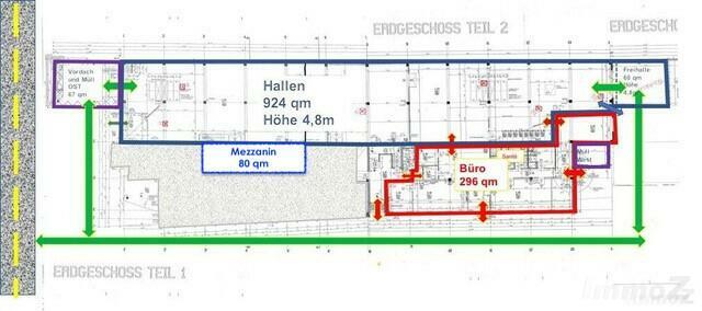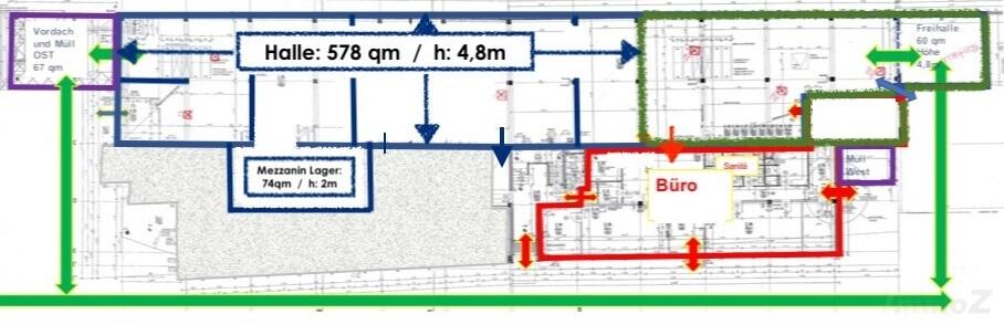 Die Hauptnutzfläche umfasst ca. 578 m² mit einer Raumhöhe von rund 4,80 Metern, ergänzt durch eine Mezzaninfläche von ca. 72 m² mit einer Raumhöhe von etwa 2 Metern –
