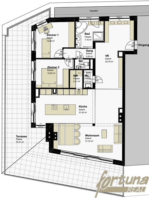 Highlight dieser Wohnung ist die großzügige Dachterrasse mit einem sagenhaften Fernblick über die Stadt, weit entfernte Orte, bis hin zu Stift Göttweig. Großflächige Terrassentüren bzw. bodentiefe Fensterflächen auf drei Seiten gewährleisten direkte Sonneneinstrahlung
