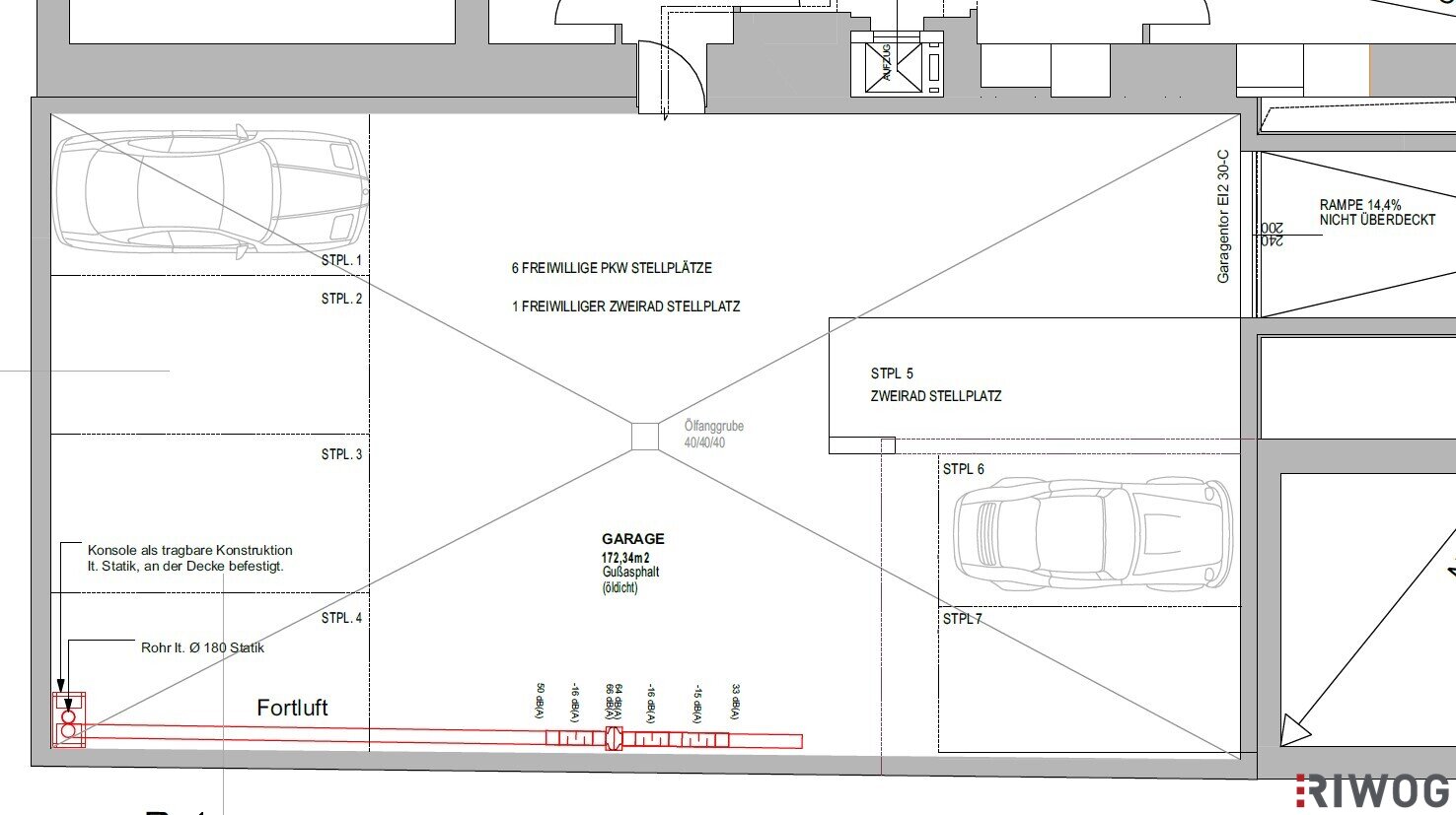 Die Tiefgarage befindet sich im Innenhof eines Wohnhauses. Über ein elektrisches Haustor gekoppelt mit einer Ampelanlage gelangt man direkt ohne Kurven in diese Tiefgarage. Die Zufahrt ist über das