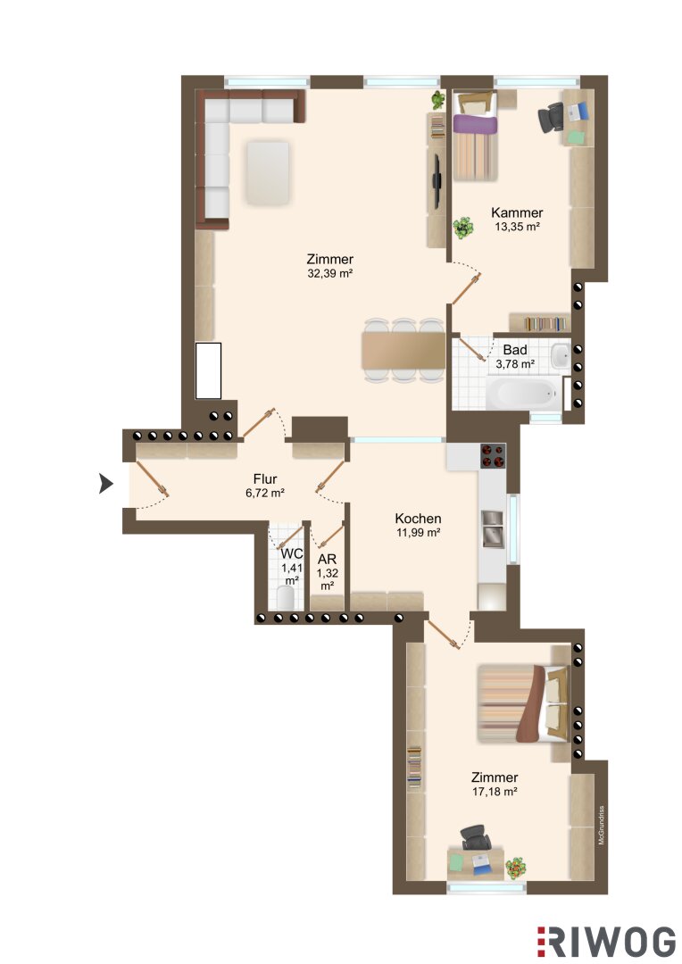 Das Schlafzimmer ist hofseitig ausgerichtet und somit in absoluter Ruhelage. Neben einem Abstellraum bietet