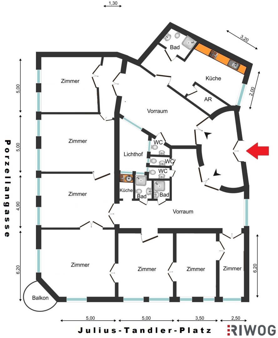 Das helle Büro im 4. Liftstock (letzter Stock) liegt in verkehrsgünstiger Lage direkt am Julius-Tandler-Platz gegenüber des Franz-Josefs-Bahnhof. Insgesamt stehen 270m² Fläche auf 7 Zimmer, die (bis auf eines) einzeln begehbar sind (siehe Grundriss).