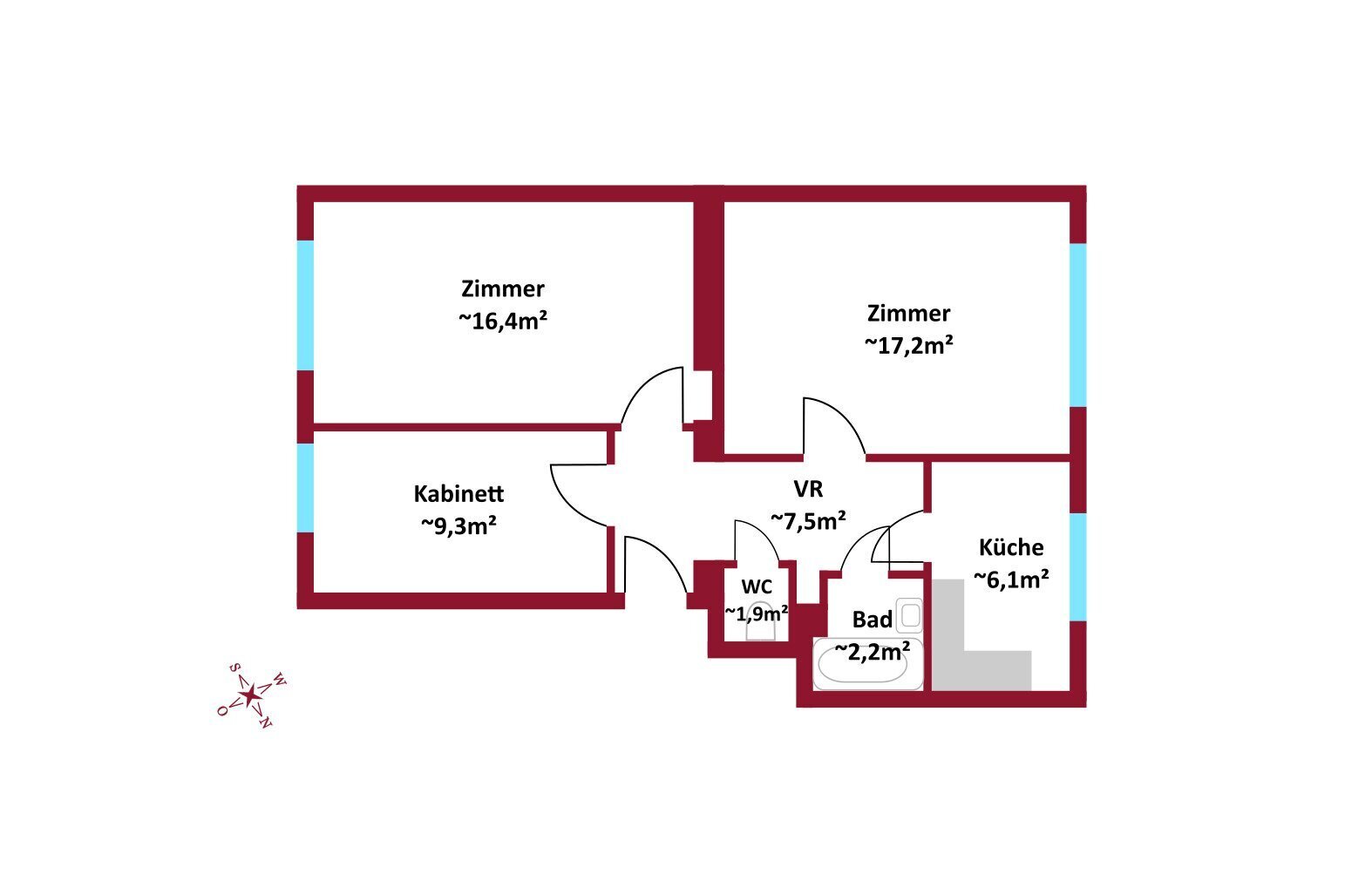 Die west-östlich ausgerichtete 3-Zimmer-Wohnung liegt im 3. Stock eines Gebäudes mit Lift und verfügt über eine Wohnfläche von ca. 60 m².