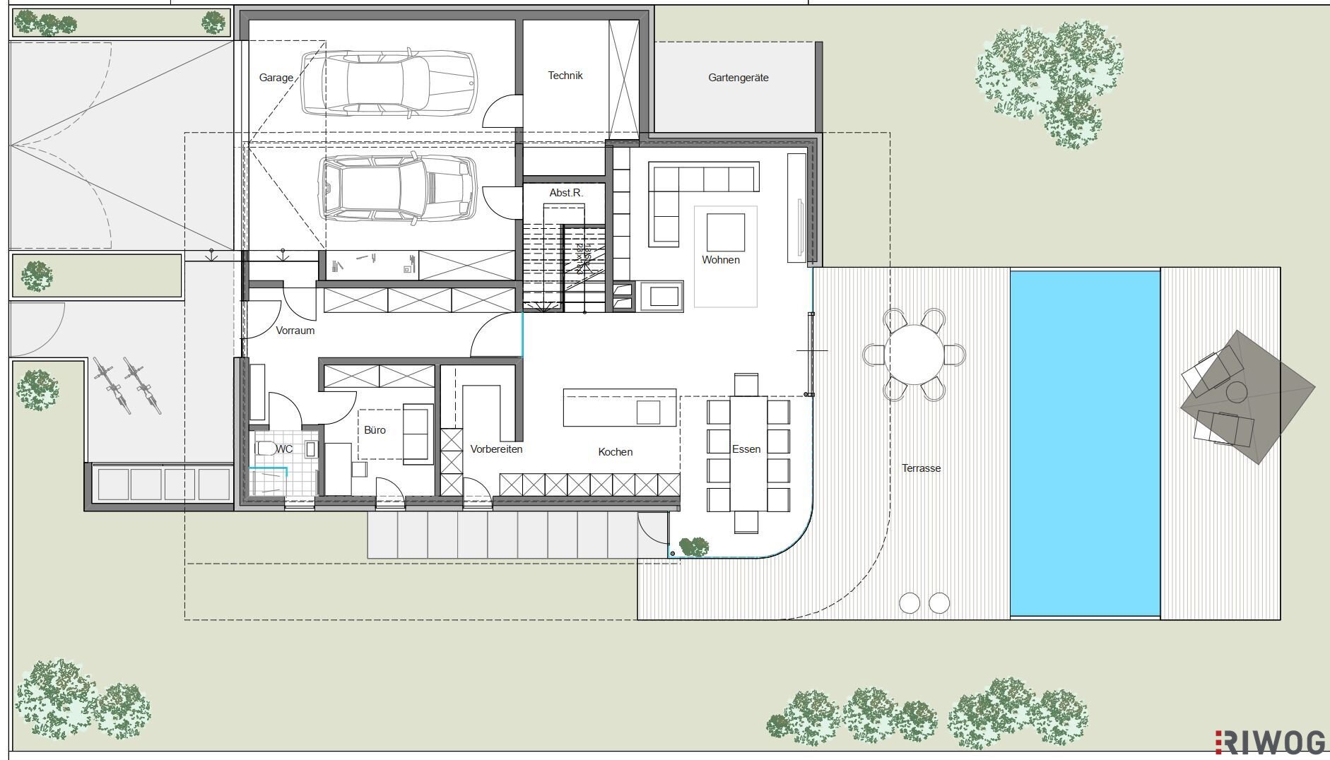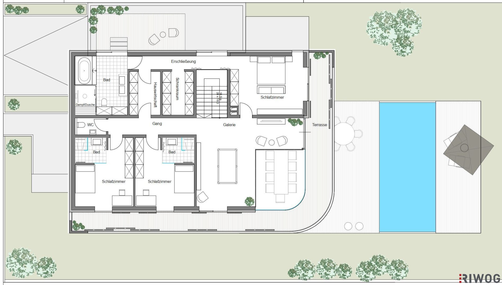 Die ca. 240 m² Wohnfläche sind auf zwei Geschoße aufgeteilt. Im Erdgeschoß sind neben einem Entrée, einem Duschbad/WC und einem Gästezimmer ein großer Wohn- Essbereich, eine Küche mit Kochinsel und eine weitere, abgetrennte